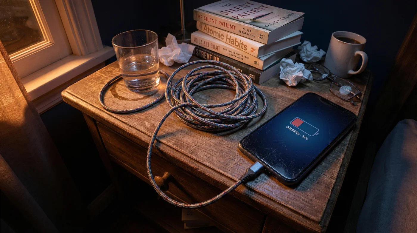 Apagas la luz, te acomodas en las sábanas y estiras la mano hacia el piso. Ahí está, como siempre, ese grueso cordón trenzado de tres metros que cruza la habitación entera para que puedas seguir deslizando videos mientras el sueño llega. Es el ritual moderno del descanso.