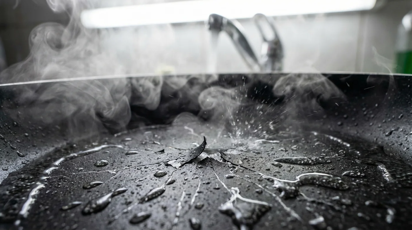 Cuando lavas la sartén aún a 200 °C con agua de la llave a unos 20 °C, fuerzas a los materiales a encogerse en un ataque microscópico. El grueso del metal sobrevive el susto, pero la película plástica superficial simplemente se quiebra por la inmensa tensión física. No verás las grietas al principio, porque son fisuras diminutas camufladas bajo el brillo oscuro y liso del fondo.