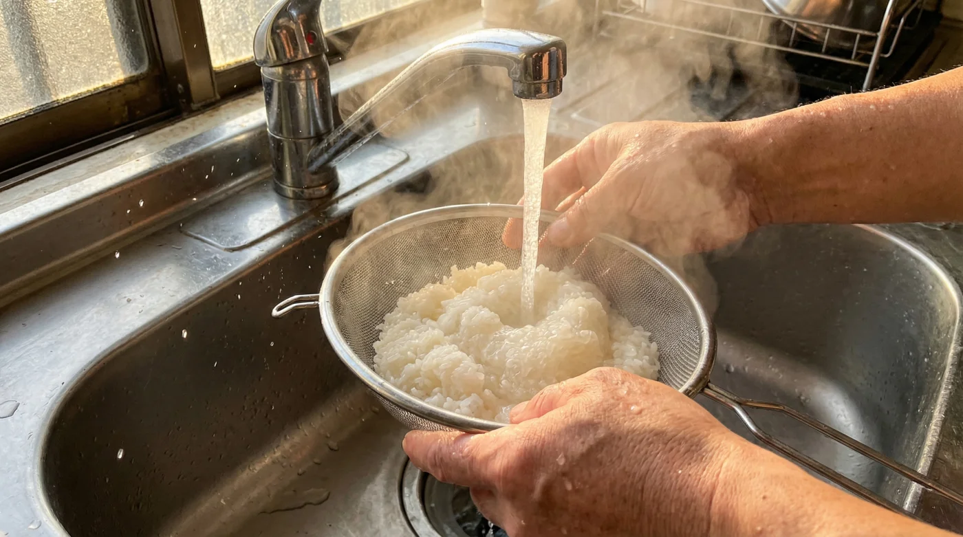 Piensa en un grano de arroz crudo no como una piedra pequeña e impenetrable, sino como una esponja minúscula y extremadamente sedienta. Su único propósito físico es absorber humedad hasta reventar. Cuando le arrojas agua caliente directamente de la tubería, no lo estás purificando; lo estás atacando. El calor prematuro desencadena una reacción química llamada pregelatinización, un proceso que debería suceder lenta y controladamente dentro de la olla, no de golpe en tus manos.