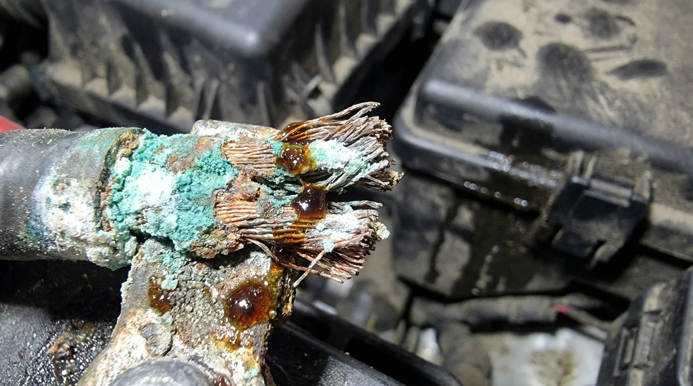 Al enfocarte únicamente en la limpieza cosmética del poste de la batería, estás ignorando por completo el ecosistema capilar de tu cableado. El azúcar es un acelerador letal cuando se combina con la humedad natural del ambiente, el calor extremo del bloque del motor y el flujo constante de electricidad. Este residuo dulce crea un puente conductor residual que atrae tierra, grasa y humedad continua, transformando la base del cable de cobre en un polvo verde y quebradizo que la corriente simplemente ya no puede atravesar con fluidez.