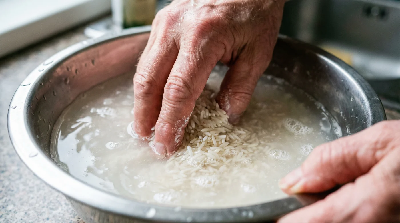 Sumerge tus dedos desnudos. Mueve los granos con suavidad, frotándolos ligeramente unos contra otros. Verás cómo el agua se vuelve opaca, idéntica a una leche diluida. Esa es la glucosa rápida que estás a punto de evitarle a tu cuerpo.