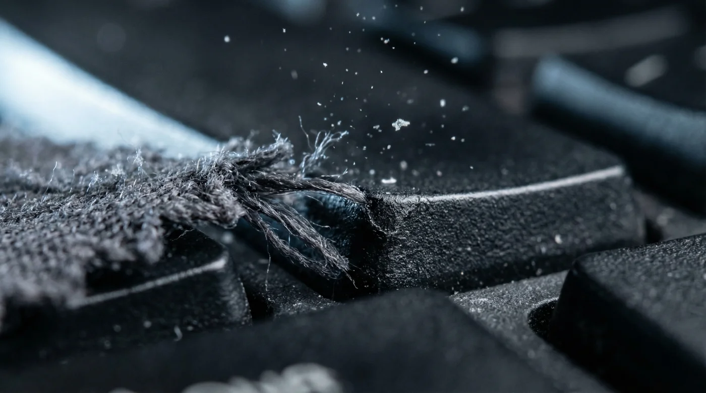 La microfibra en su estado seco, tejida con miles de hilos de poliéster y poliamida, es una trampa natural de estática cuando interactúa con el plástico ABS de tus teclas. Al tallar sin humedad, estás literalmente cargando la superficie de electrones sobrantes, arrebatándolos del material sin ofrecerles una vía de escape física segura hacia la tierra.