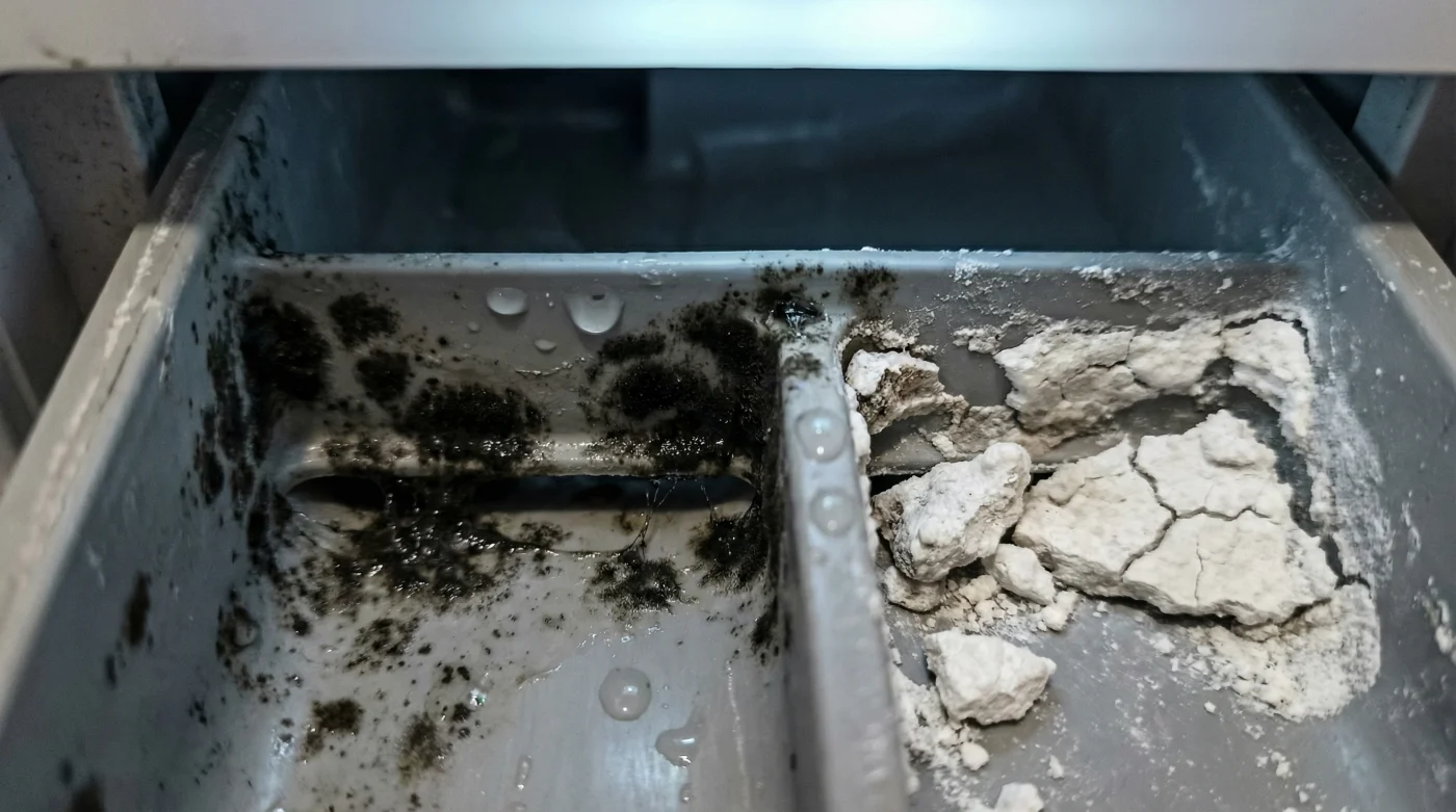 Con el paso de las semanas y la falta de ventilación, esta mezcla se seca y se convierte en una **masa de yeso húmedo**. Este material calcificado no solo estrangula el flujo del agua, obligando a la bomba a trabajar al doble de su capacidad, sino que crea la base perfecta para la proliferación de moho negro. Romper la regla y sacar el jabón de ese cajón no es un acto de negligencia, es puro instinto de supervivencia mecánica.