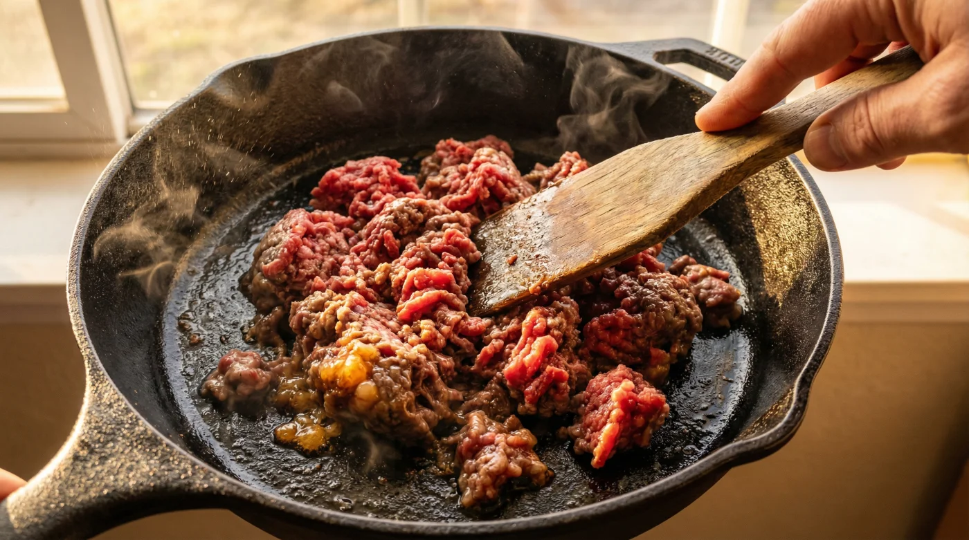 El sonido es inconfundible. Pones el sartén al fuego, esperas a que empiece a humear y dejas caer la carne molida. El chisporroteo inicial te convence de que estás sellando los jugos, tal como te enseñaron en casa. El olor a hierro y grasa llena tu cocina.