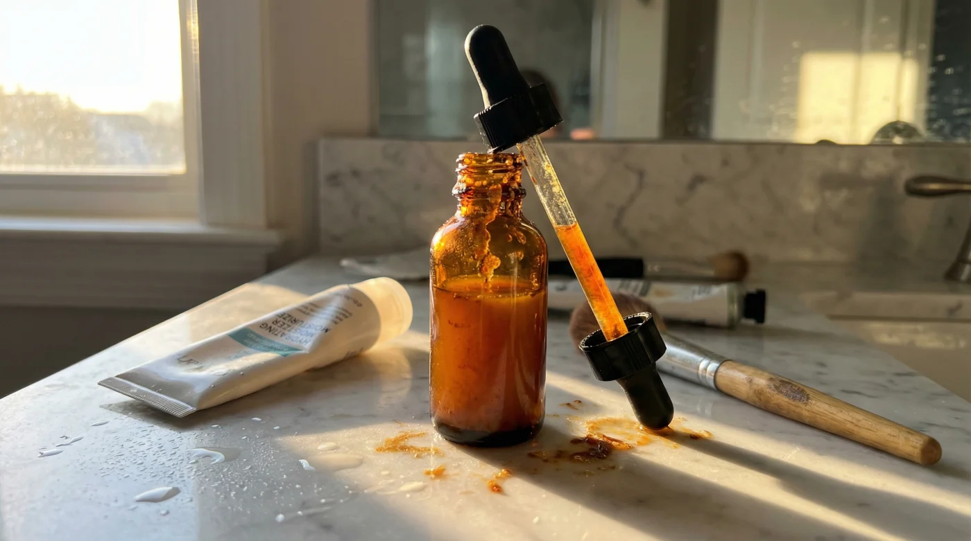 Cuando dejas tu envase junto a la crema hidratante y el contorno de ojos, en la primera línea del lavabo, estás iniciando una cuenta regresiva. Lo que compraste como un escudo antioxidante se está gestando, gota a gota, en el enemigo silencioso de tu tono natural. El hábito inofensivo de mantener todo tu arsenal de belleza agrupado por conveniencia es, de hecho, una sentencia para la química de tu rostro.