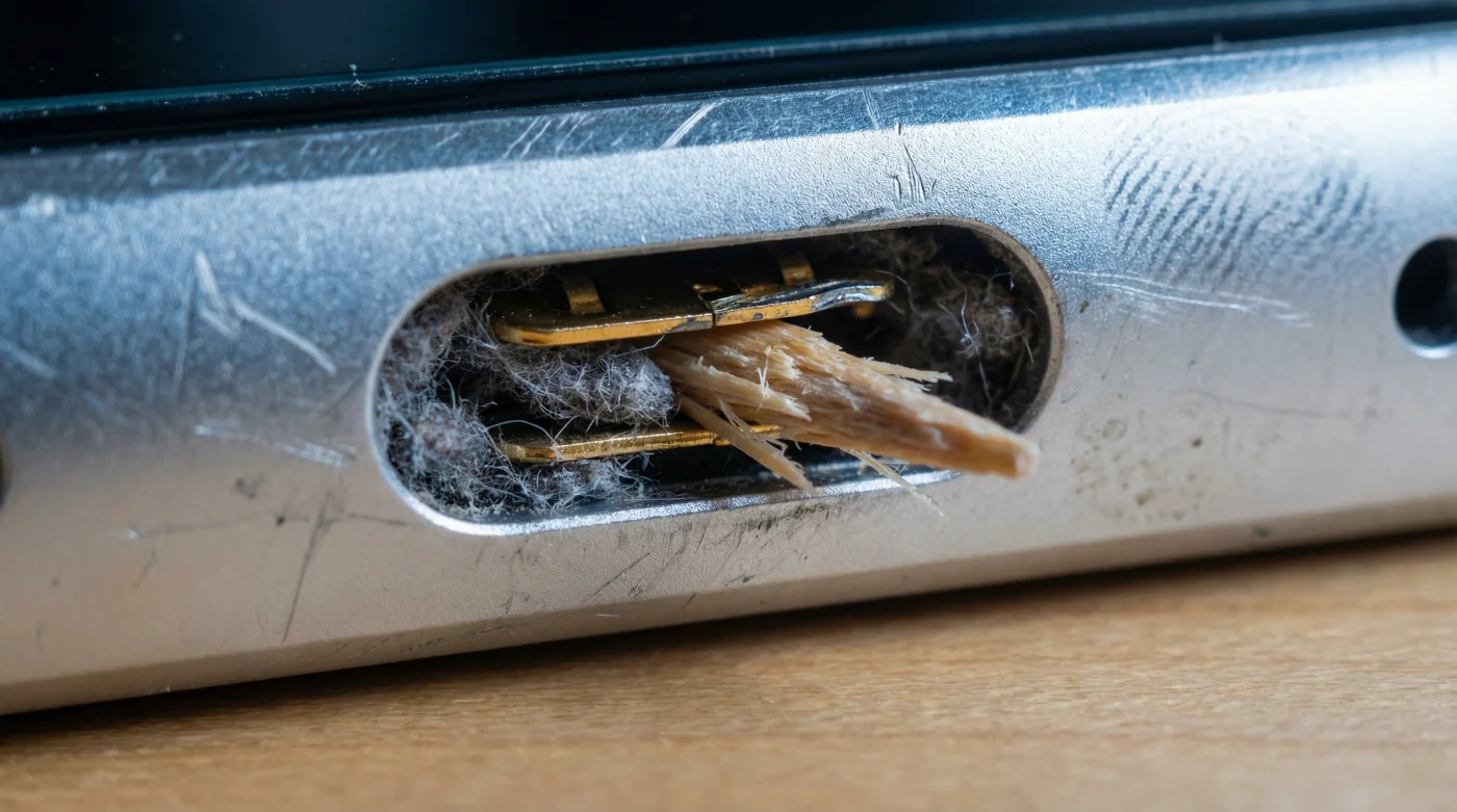 ¿Por qué mi cable se cae solo del puerto y no hace ese clic firme? La pelusa que has empujado al fondo crea un tope elástico. Al intentar forzar el cable contra ella repetidas veces, doblas los pines y pierdes el agarre mecánico original del puerto.