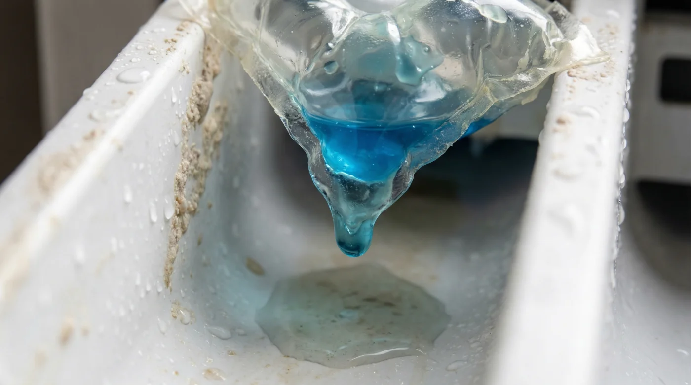 Cuando dejas la cápsula en el cajón superior, el flujo moderado de agua apenas logra ablandar la capa externa. El plástico se vuelve gelatina, resbalando perezosamente por las mangueras internas. En lugar de llegar a tu ropa, se adhiere a las paredes de las tuberías corrugadas, creando una película pegajosa que atrapa pelusas, suciedad y bacterias en cada ciclo de lavado.