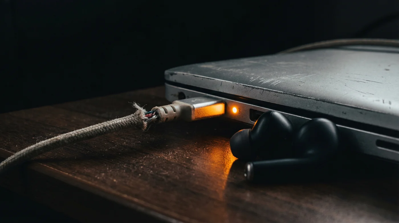 Es un ritual moderno de pura conveniencia. El cable siempre está ahí, enredado entre tu taza de café y algunas notas adhesivas. Parece una solución aparentemente inofensiva que mantiene tu música favorita lista para el trayecto a casa por la tarde.