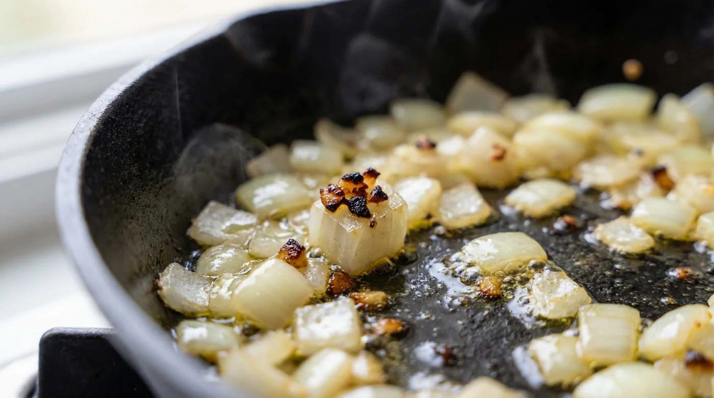 El aceite humea ligeramente en la sartén de hierro negro, apenas rozando los 160 grados Celsius. En la tabla de madera cortas metódicamente media cebolla blanca y tres dientes grandes. Con un solo movimiento del cuchillo, deslizas todo al mismo tiempo sobre la grasa caliente. El siseo es inmediato y reconfortante.