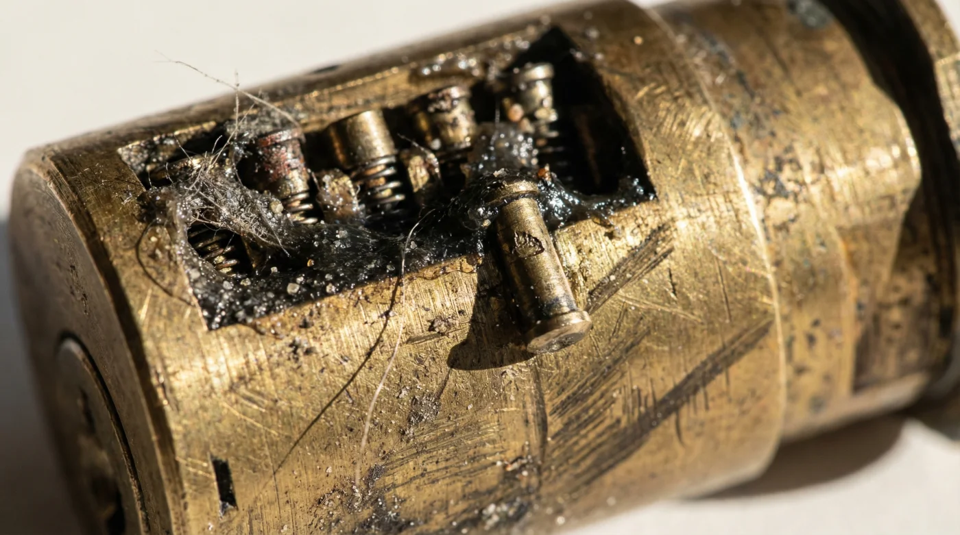 Ese lodo interfiere directamente con los pequeños resortes y pernos de latón que conforman el corazón de tu chapa. Con el paso de los meses, los pasadores se quedan atascados en la posición incorrecta, impidiendo que los dientes de tu llave original puedan alinearlos para girar el tambor.