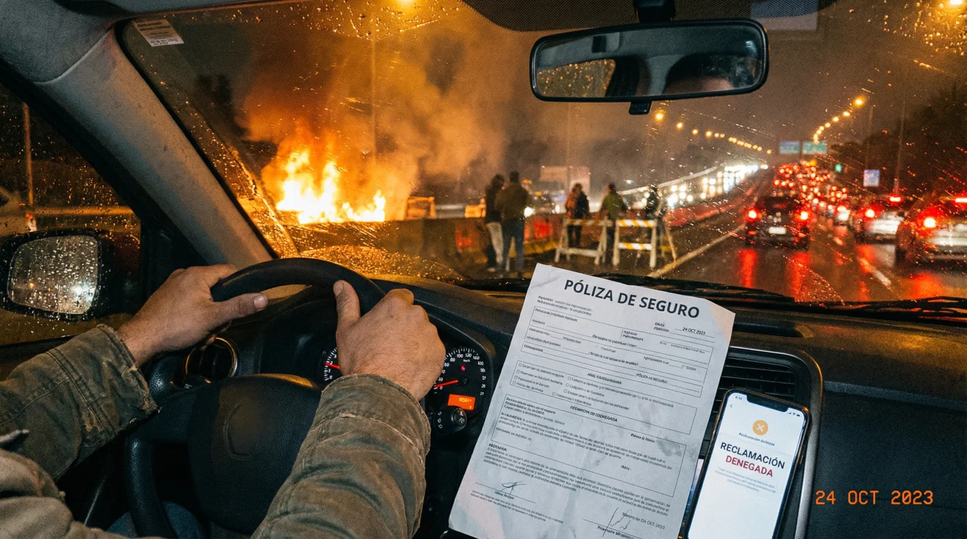 El sector asegurador clasifica estos eventos bajo la categoría legal de motín, alboroto popular o daño por turba. Si un grupo de manifestantes rompe tu parabrisas porque intentaste avanzar a vuelta de rueda, el ajustador dictaminará inmediatamente que fue un acto de vandalismo excluido, transfiriendo el peso total de la factura por reparaciones directamente a tu bolsillo.