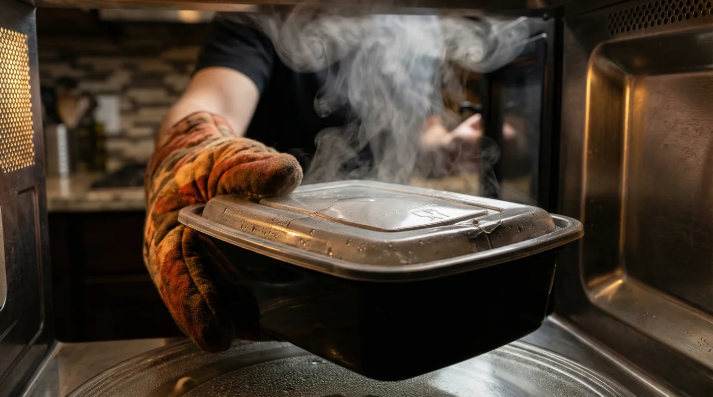 Imagina usar un impermeable de hule dentro de un sauna. El material no se va a deshacer por el calor, pero va a sudar, a desprender vapores y a cambiar su composición. Esta es la realidad de tu horno de microondas cuando interactúa con los plásticos opacos. El calor radiante que penetra el agua de tus alimentos también estresa los polímeros del envase.