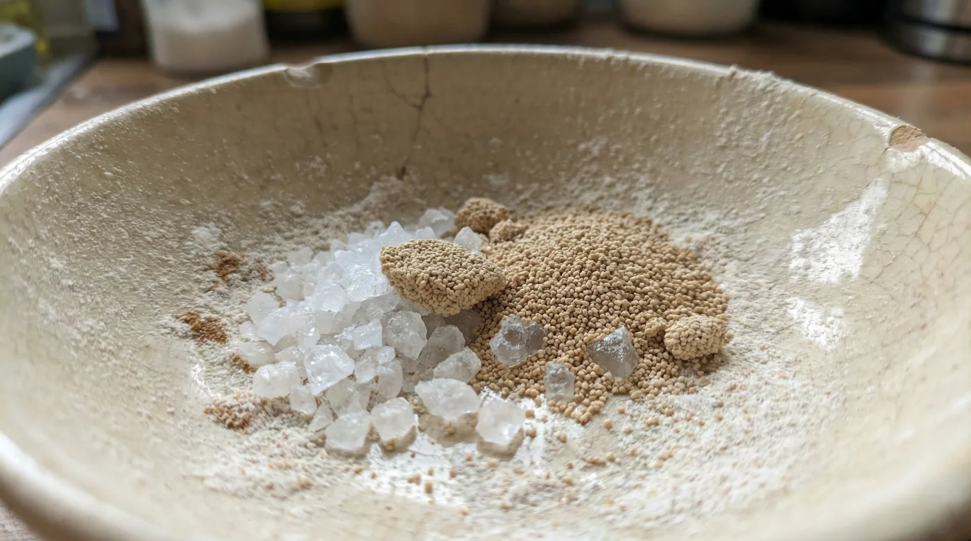 Imagina a la levadura como diminutos seres aletargados que necesitan apenas un abrazo de agua tibia para despertar. Si la sal se cruza en su camino antes de que la gruesa capa de harina los blinde, extrae violentamente el líquido vital del interior de las células de la levadura. Literalmente, las matas de sed antes de que puedan exhalar el gas carbónico que inflará tu pan. Es un error invisible y silencioso que ocurre en los primeros diez segundos de tu preparación.