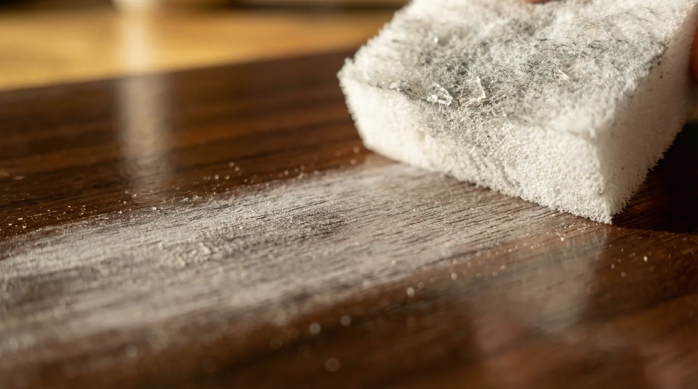 La melamina no reconoce la diferencia entre una mancha de grasa superficial y una laca artesanal aplicada a mano; su único trabajo es destruir lo que toca hasta dejarlo plano y sin vida.