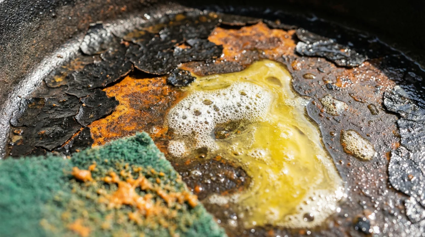 | Jabón líquido cítrico (Desengrasante) | Rompe los enlaces de grasa polimerizada; expone el metal desnudo y fomenta la aparición de óxido rojo intenso en minutos. | Ninguno. Reduce la vida útil del metal y arruina la propiedad antiadherente natural que tanto cuesta conseguir. |