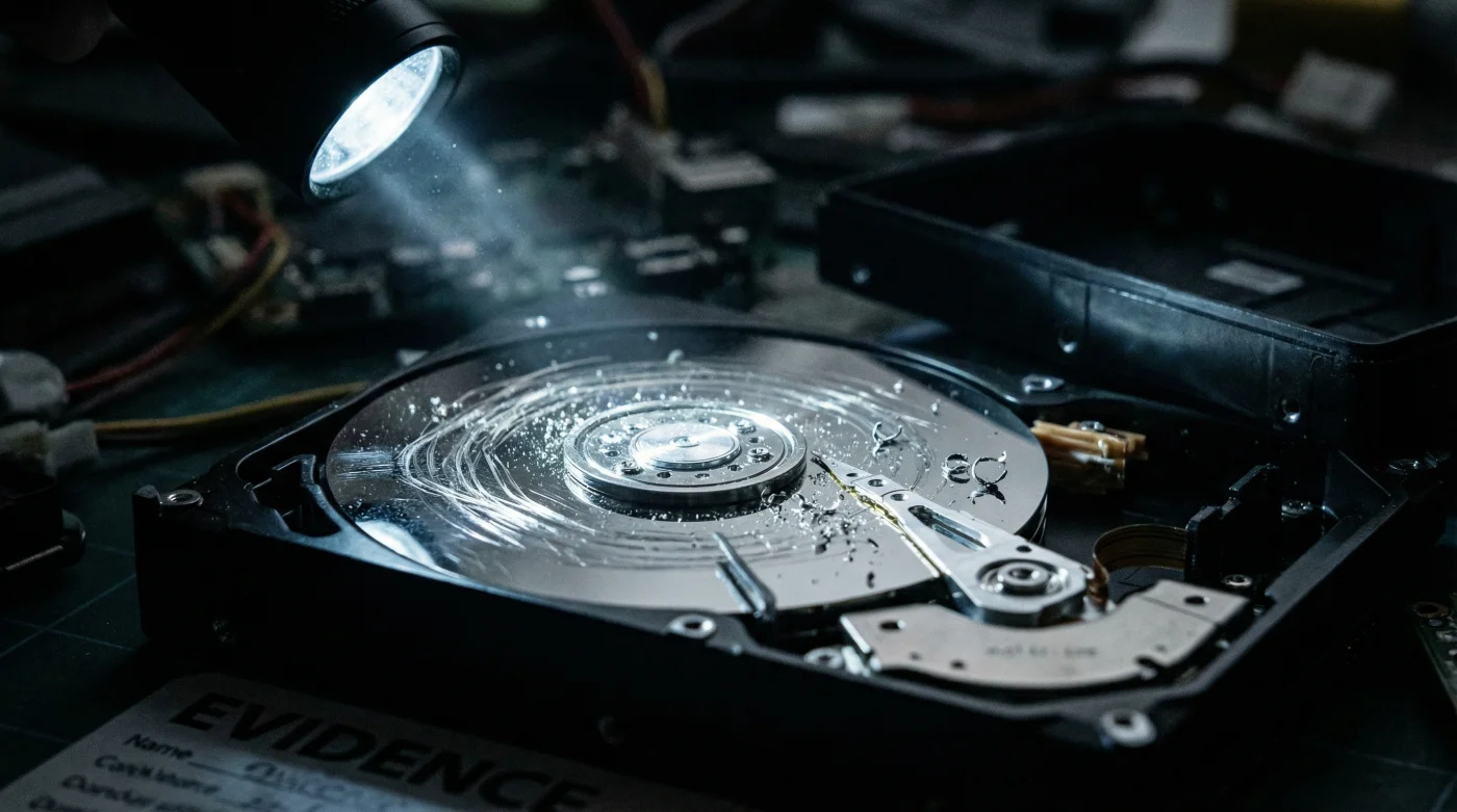 En cuestión de milisegundos, el cabezal pierde su delicado colchón de aire protector y aterriza violentamente contra la superficie giratoria. Una fricción que raya todo, transformando tus memorias irremplazables y bases de datos en un puñado de polvo metálico inservible.