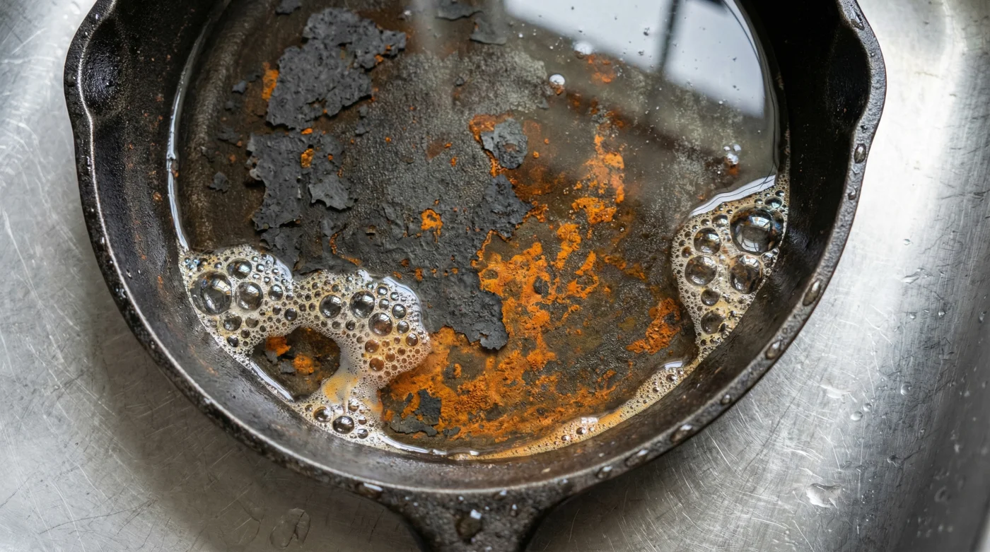 El hierro fundido no es solo metal, es un archivo culinario. Cada vez que cocinas, capas microscópicas de aceite se calientan y se fusionan con la superficie en un proceso llamado polimerización. Es como si el sartén construyera su propia armadura negra y antiadherente. Pero cuando decides dejarlo sumergido en agua con detergente líquido, estás enfrentando esa delicada armadura contra agentes diseñados específicamente para destruir la grasa a nivel molecular.