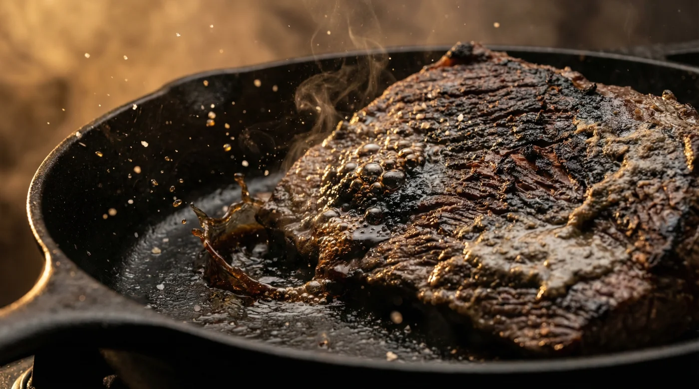 Imagina el sonido. Una sartén de hierro fundido zumbando sobre el quemador al máximo. Dejas caer las tiras de res, el chisporroteo inunda tu cocina y viertes de inmediato ese líquido oscuro sobre la carne ardiente.
