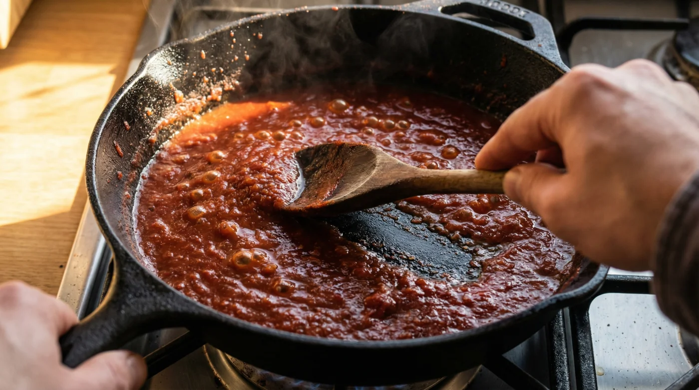 Es domingo por la tarde y el olor a ajo dorándose en aceite de oliva llena tu cocina. Tienes sobre la hornilla ese pesado sartén negro que heredaste o compraste con mucha ilusión. Abres un frasco o una lata de salsa de tomate comercial, buscando resolver la comida con unas rápidas entomatadas o una pasta reconfortante para cerrar la semana.