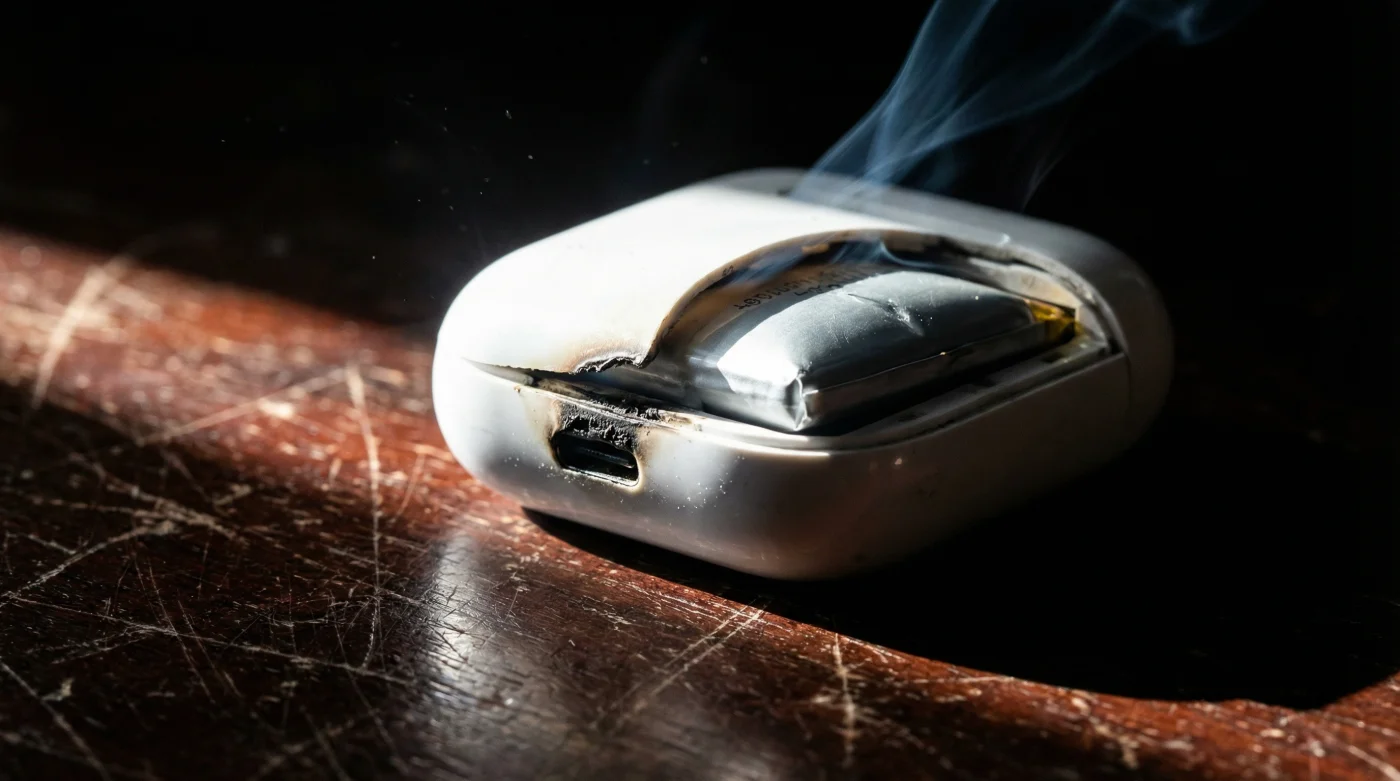 ¿Cómo puedo estar seguro de si la batería de mis audífonos ya sufrió daños térmicos? Simplemente revisa si el estuche cierra perfectamente. Si notas una pequeña apertura inusual, si los auriculares no hacen contacto firme con los pines internos, o si el plástico de la base cruje al apretarlo ligeramente, la celda inflamada ya está empujando las paredes plásticas.