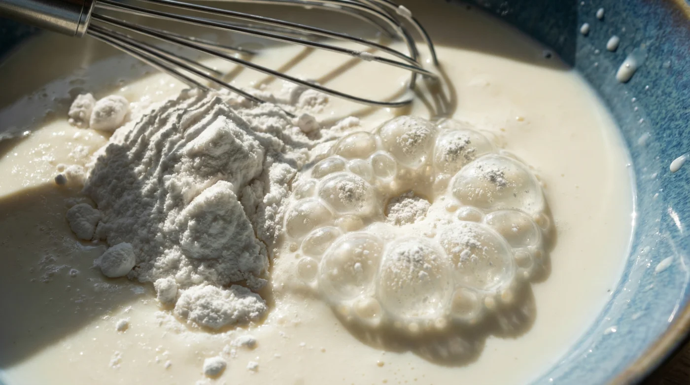 Si lo liberas dentro de un tazón lleno de leche y huevos a temperatura ambiente, suelta su fuerza de inmediato. Las burbujas de dióxido de carbono estallan en la humedad del tazón, perdiéndose en el aire de tu cocina en lugar de quedar atrapadas en la red de gluten mientras se hornea. El gas se esfuma inútilmente frente a tus ojos sin que lo notes.