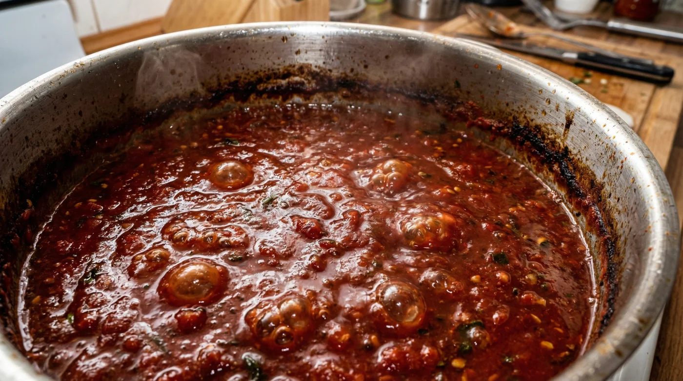 Cuando expones la salsa al aire y al calor alto, la evaporación rápida oxida los azúcares naturales del tomate. El dulzor muere por asfixia térmica. Lo que queda en el fondo de tu olla de peltre es el esqueleto ácido de la fruta, desprovisto de su amabilidad original.