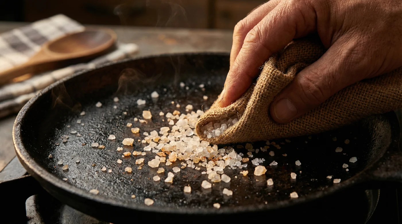 El hierro colado jamás olvida lo que cocinas en él; la sal gruesa simplemente borra sus malos recuerdos dejando intacto su carácter profundo.