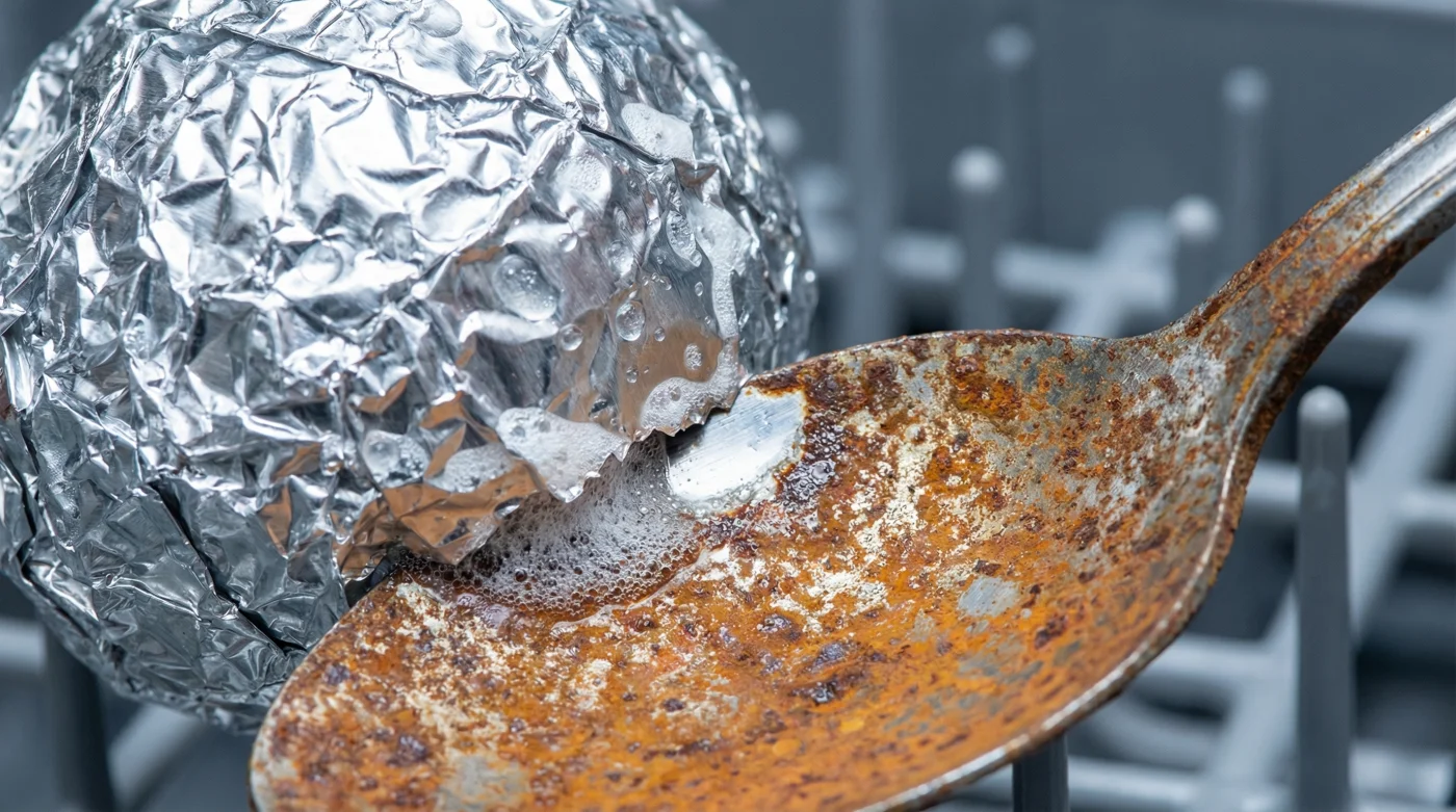 Piensa en tu lavavajillas no como una simple tina de remojo, sino como una cámara galvánica. Cuando introduces una bola de papel aluminio arrugado entre tus utensilios, no estás arrojando basura por accidente. Estás colocando estratégicamente lo que la ciencia de los materiales llama un metal de sacrificio, alterando por completo las reglas de la corrosión dentro del agua.