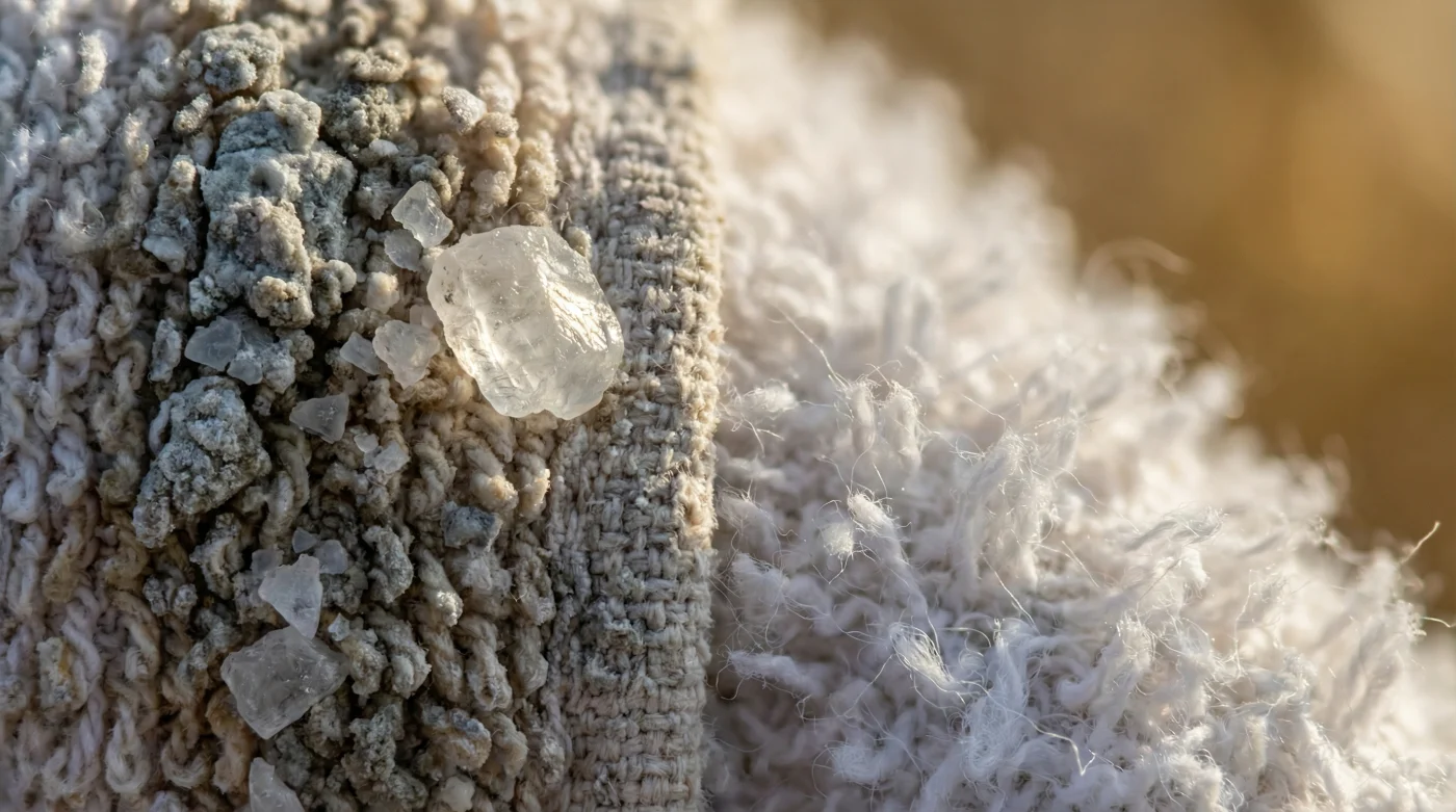 Piensa en los hilos de tus toallas como pequeños conductos que necesitan expandirse y contraerse. Cuando el agua dura pasa a través de ellos ciclo tras ciclo, deposita microscópicas capas cristalinas de minerales invisibles. Poco a poco, el magnesio y el calcio construyen una coraza dura alrededor de la fibra de algodón.