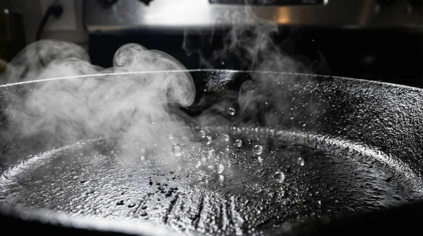 La clave real está en dominar la cantidad exacta y el contraste brusco. Un exceso de líquido terminará hirviendo tu comida; muy poco no generará el empuje de vapor necesario. El metal oscuro necesita recibir el impacto de manera completamente lateral, rozando el límite del alimento principal.