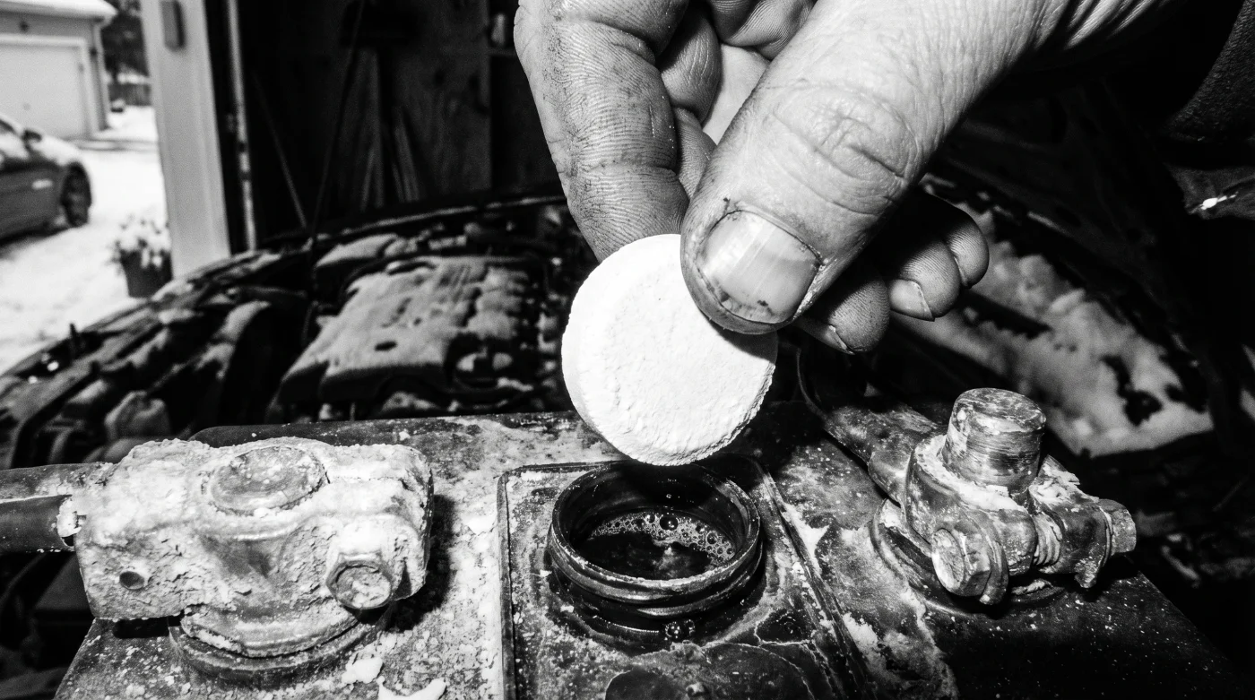 Cuando dejas caer la pastilla en esa mezcla oscura, alteras drásticamente el letargo. El ácido sulfúrico reacciona de inmediato al entrar en contacto con su pariente químico, creando una especie de fiebre artificial dentro de las celdas de la batería. Esta efervescencia actúa como un masaje vigoroso en los músculos entumecidos del sistema eléctrico, modificando la densidad del electrolito lo suficiente para liberar el último suspiro de carga almacenada que el hielo había secuestrado momentáneamente.
