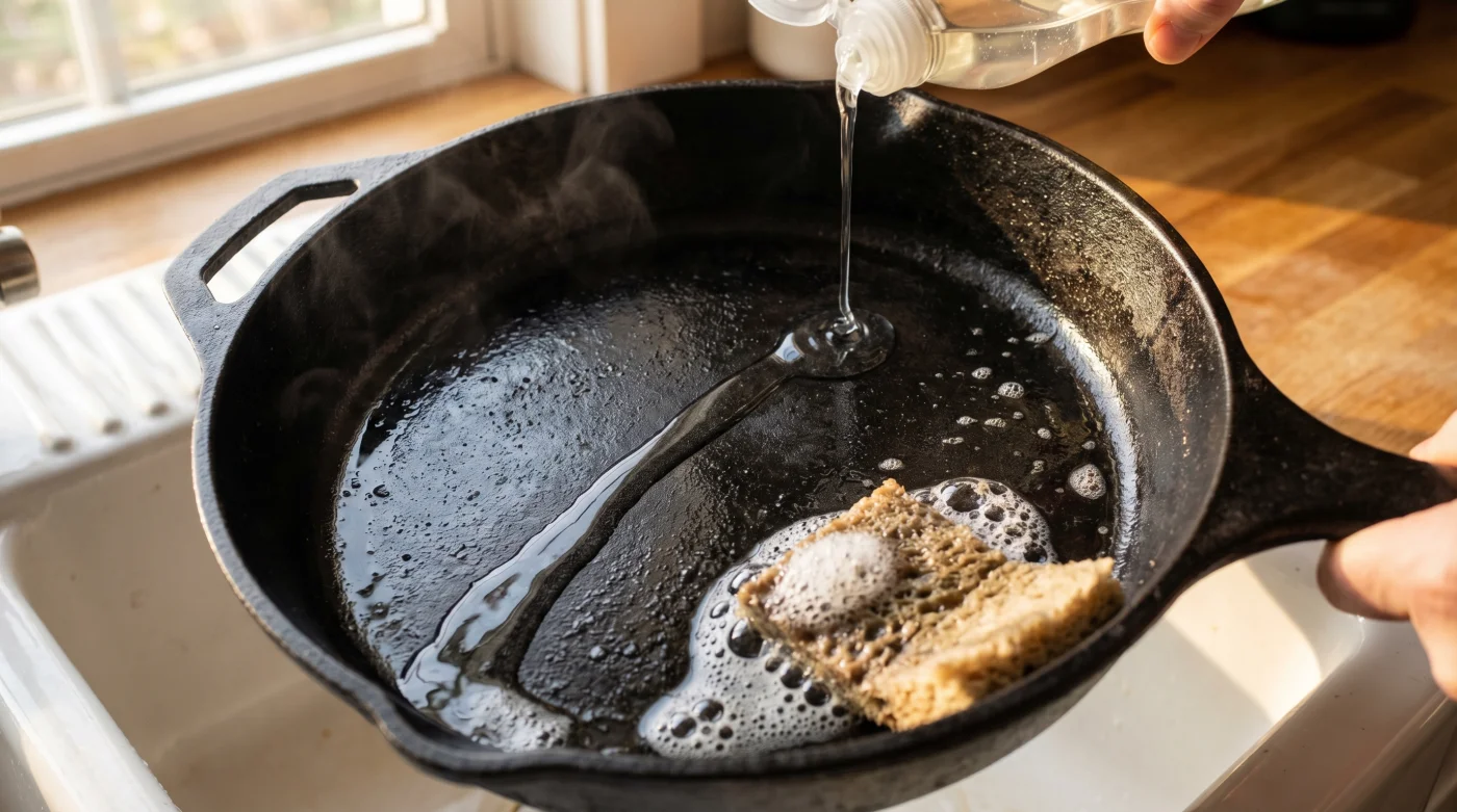 Al negarte a usar espuma limpiadora por miedo a un mito obsoleto, estás cocinando sobre una película de manteca descompuesta. Esa barrera rancia oculta la verdadera capacidad térmica del hierro fundido, provocando que tus huevos estrellados o tus tortillas de harina se adhieran tenazmente al fondo ahumado.