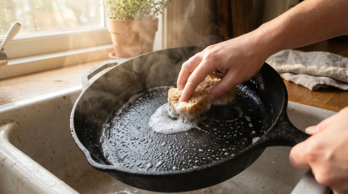 Para el purista de los sabores que fríe diariamente con manteca de puerco fresca, el agua tibia y una sola gota de limpiador líquido bastan para cortar el exceso pesado. El objetivo es preservar la capa microscópica de hierro, no dejar una plasta pegajosa.
