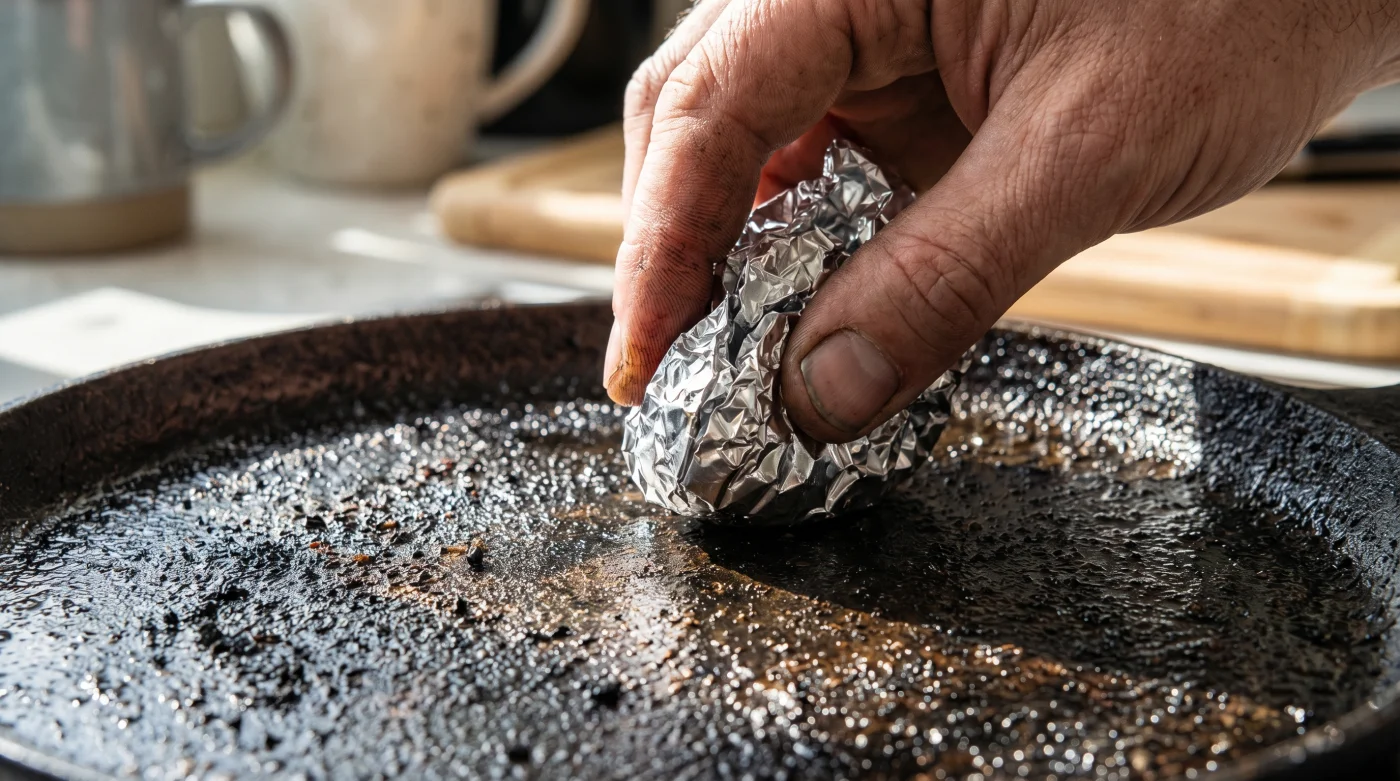 Respeta el sazonado original. Para el purista del hierro fundido, sabes que el jabón es tu enemigo. Aquí, el papel metálico actúa como un protector preventivo. Al terminar de cocinar a más de 200 grados Celsius, coloca la hoja sobre los restos grasos, presiona ligeramente con una espátula para crear vacío y deja que el calor latente derrita la grasa adherida para luego retirarla con un simple paño.