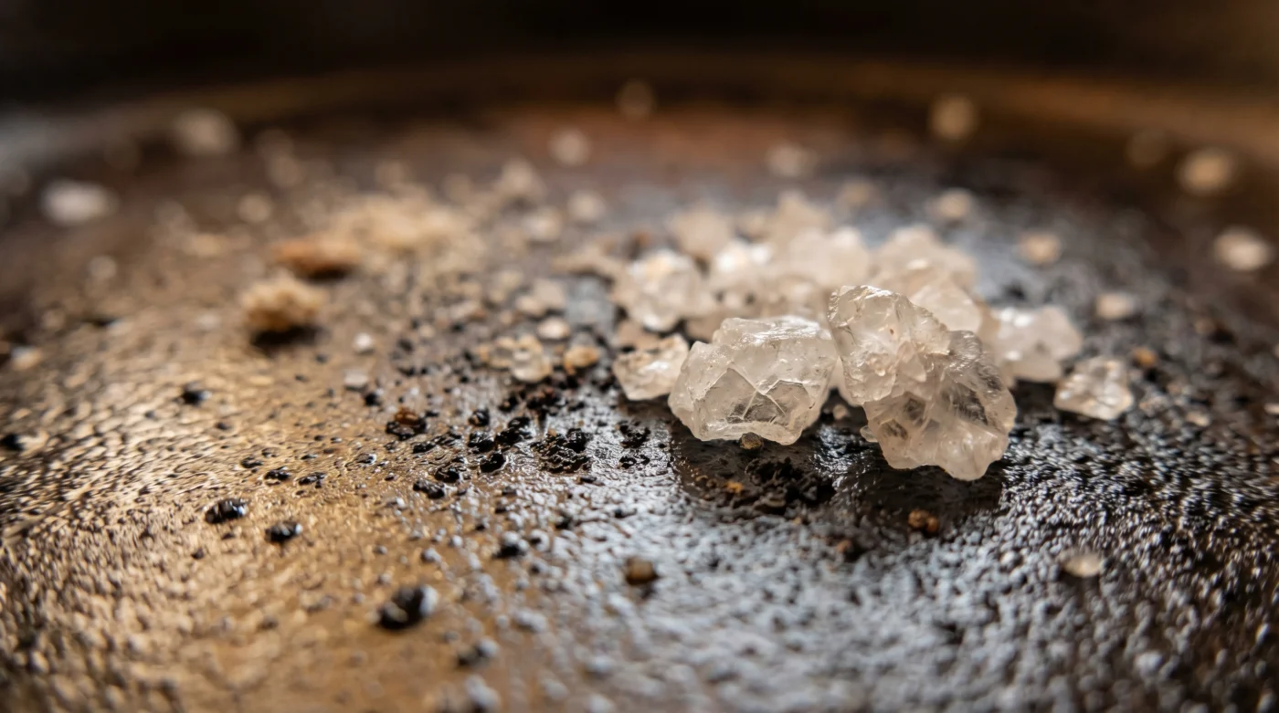 Aquí es donde ocurre el cambio de perspectiva que altera por completo la forma en que cuidas tus utensilios. En lugar de inundar el hierro con detergentes líquidos que barren con los aceites protectores, dejándolo expuesto como una piel agrietada en invierno, necesitas aplicar un exfoliante térmico. La sal gruesa caliente, lejos de ser un abrasivo destructivo, funciona como un compuesto pulidor de precisión.