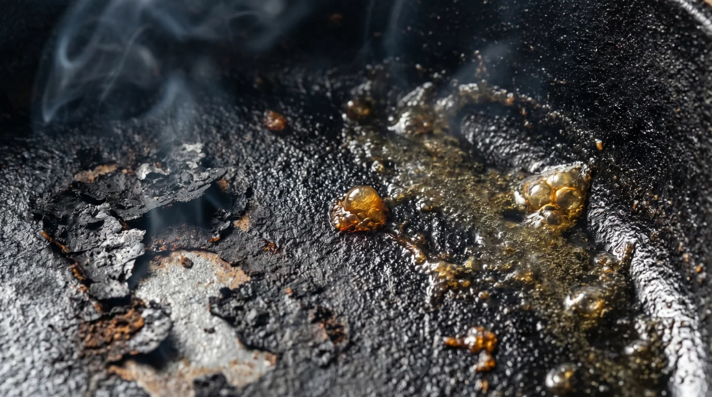 El aceite de oliva virgen extra tiene un punto de humo ridículamente bajo para estos propósitos, rondando apenas los 160 grados Celsius. Al entrar en contacto con el fuego medio-alto de una estufa convencional, no se entrelaza ni polimeriza; simplemente colapsa y se calcina. En lugar de crear un escudo duro, se transforma en un residuo carbónico, denso y chicloso. A medida que sigues cocinando, esta costra acumula ceniza microscópica y eventualmente termina desprendiéndose en escamas negras, llevándose consigo cualquier nivel de antiadherencia que la sartén tuviera antes.