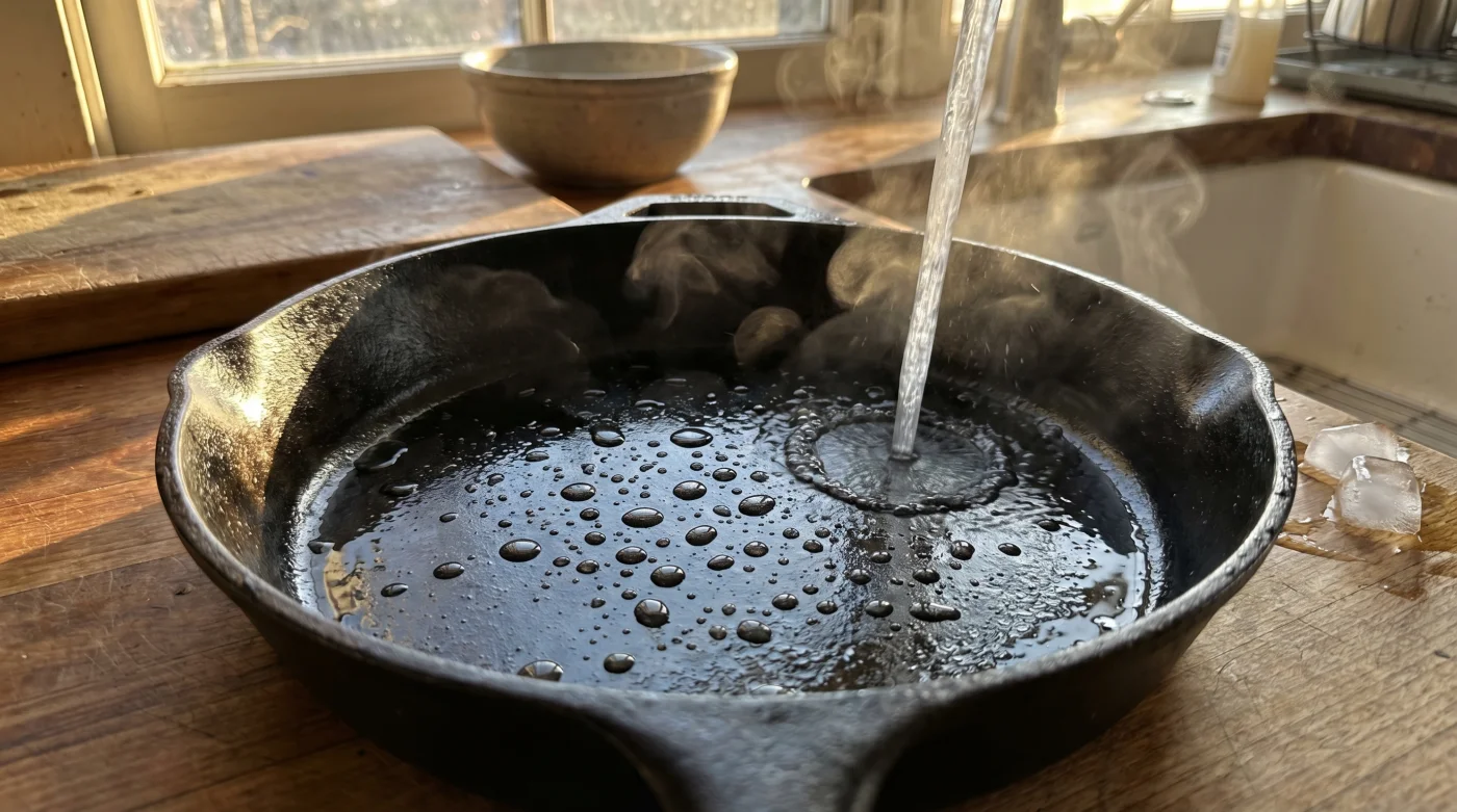 Aquí es donde el choque térmico inverso actúa, como una maravilla de la física que debes incorporar a tu vida. Cuando aplicas agua a cero grados Celsius sobre el hierro aún caliente (nunca al rojo vivo, sino justo en ese momento después de cocinar cuando el metal aún retiene una temperatura media), el cambio brusco no rompe el metal. Si tu sartén es de calidad gruesa y tradicional, este frío extremo cristaliza la grasa superficial casi de manera instantánea. A este fenómeno se le conoce como polimerización forzada.