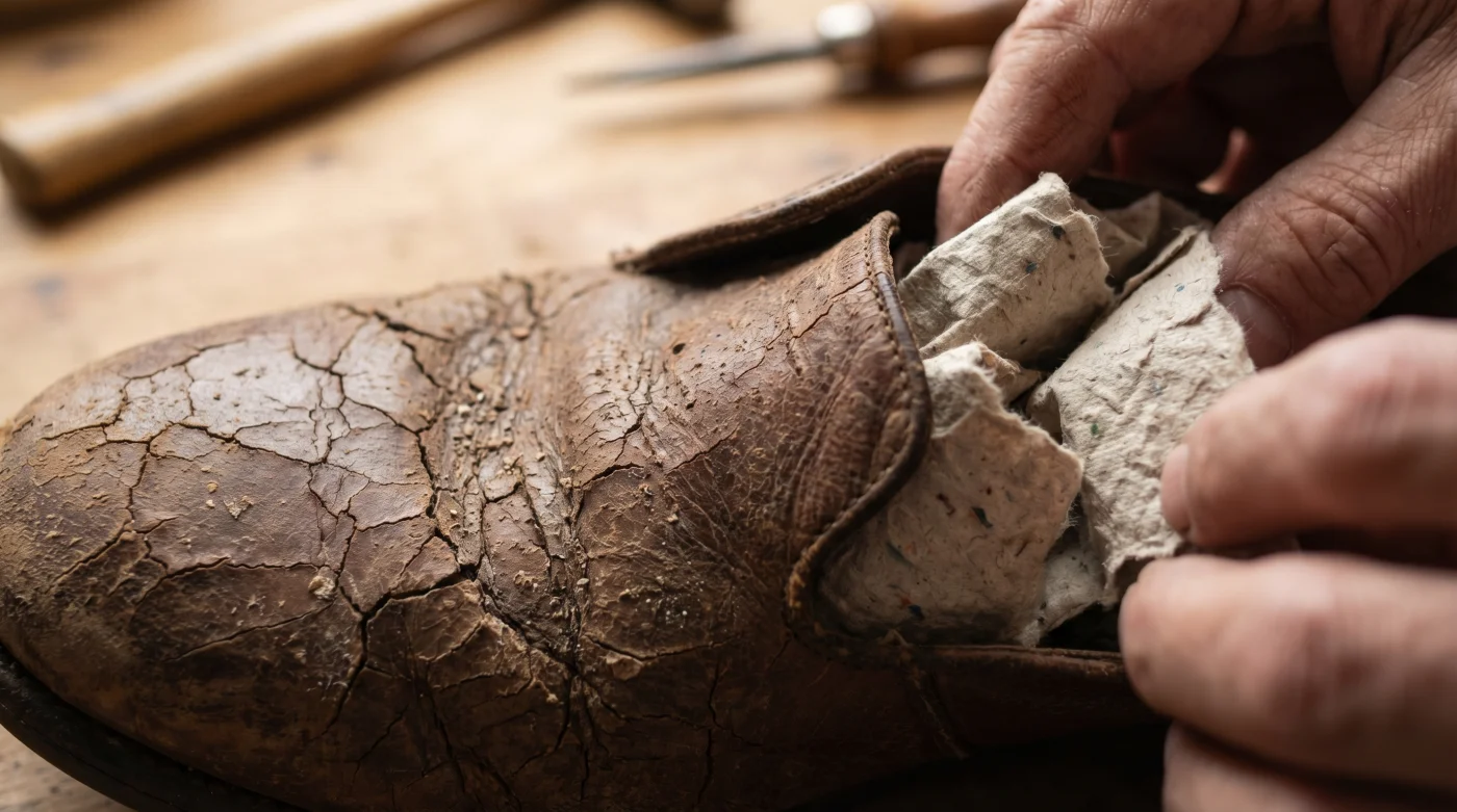 - El relleno estratégico: Haz bolas sueltas de papel estraza o periódico viejo. Evita las hojas de revistas con tinta brillante. Introdúcelas hasta la punta del zapato.