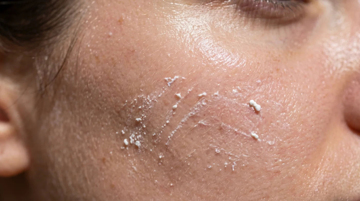 Hay unas sombras extrañas en tu rostro. Pequeñas acumulaciones amarillentas o blanquecinas en los bordes de tus mejillas y cerca de la mandíbula. No es daño por pigmentación. Es una colisión química que ocurre justo sobre tu epidermis. Al aplicar tu filtro solar sobre una base rica en lípidos y ceramidas, estás impidiendo que la fórmula de defensa se ancle correctamente a tus poros.