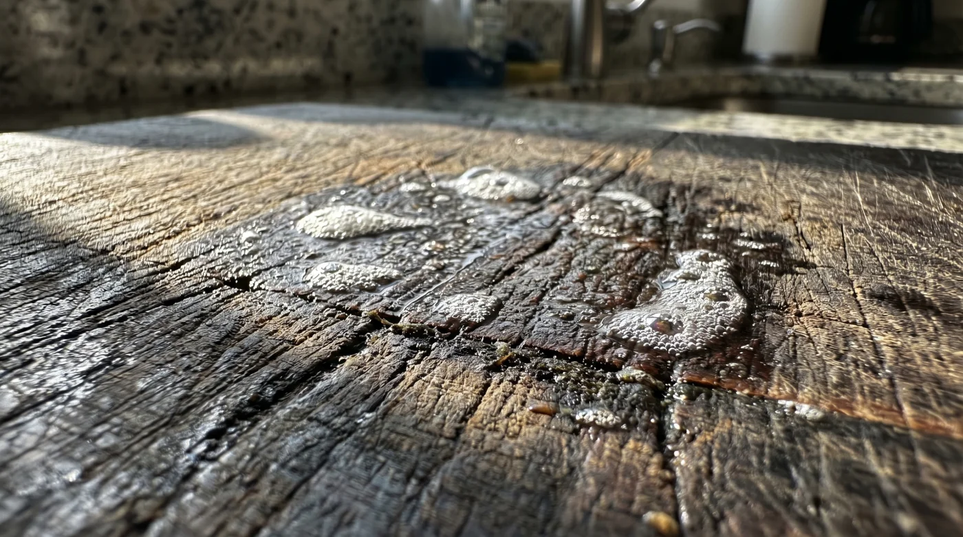Pero esa sensación de limpieza impecable es una trampa visual. Bajo esa superficie que ahora huele a limón sintético y químicos industriales, estás ahogando la madera. Ese detergente espeso que es tan eficiente para arrancar la grasa quemada de tus sartenes está haciendo algo terrible en tu tabla: está rompiendo la tensión superficial del agua y empujando las bacterias crudas hacia lo más profundo del material.