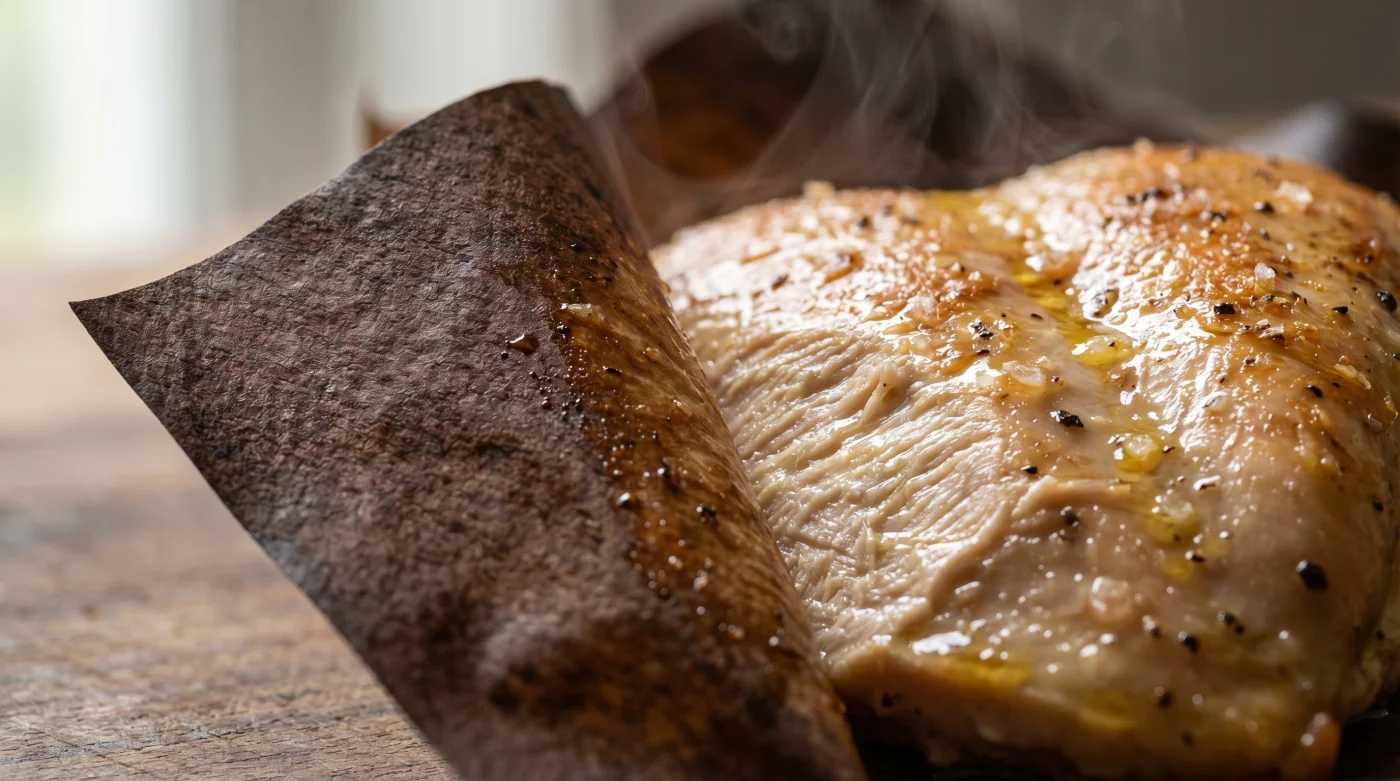 Al hacer esto, creas un microclima. El papel grueso actúa como una segunda piel, atrapando la humedad natural exactamente donde pertenece. La pechuga se cocina en sus propios jugos presurizados suavemente, logrando masticar carne muy suave, casi como si hubiera pasado horas en cocción lenta, pero en una fracción del tiempo.
