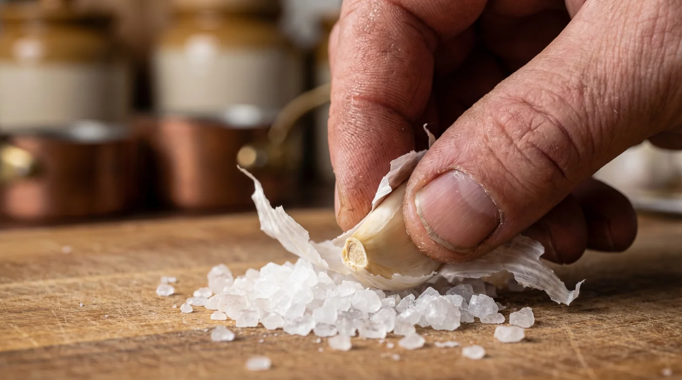 Pero la verdadera magia de este truco reside en la química preventiva. El olor característico del ajo proviene de los aceites volátiles que se escapan al presionar o rasgar la carne del vegetal. La sal gruesa, siendo un desecante natural excepcional, actúa como una esponja microscópica que atrapa esos aceites al instante, antes de que puedan aferrarse a los poros de tus dedos. Pelas el ajo con facilidad, pero el olor se queda atrapado en los cristales, no en tu piel.