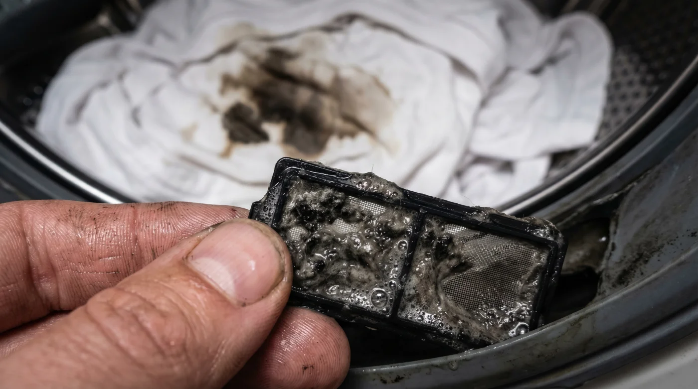 Ese lodo no es tierra del exterior, es pelusa vieja y pudriéndose mezclada con restos de jabón líquido que tu lavadora ya no es capaz de filtrar hacia el drenaje.