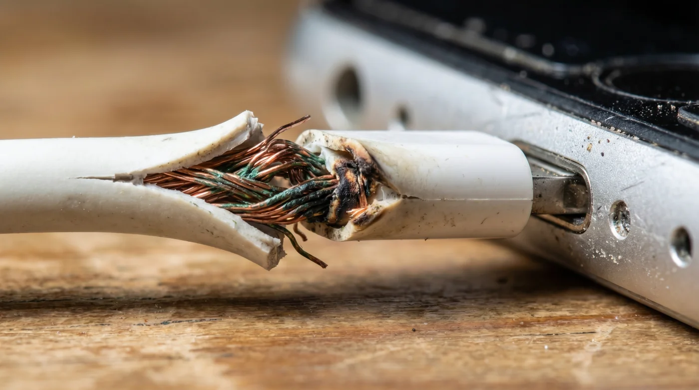 El borde amarillo cerca del conector es la primera señal. Llevas meses doblando ese cable en ángulos imposibles sobre tu pecho mientras lees en la cama. Poco a poco, la cubierta blanca se ha ido desprendiendo, revelando una red de hilos plateados que parecen un nervio expuesto. Lo miras, lo ajustas un poco y lo conectas. Suena la campana de carga. Listo, problema para el yo del futuro.