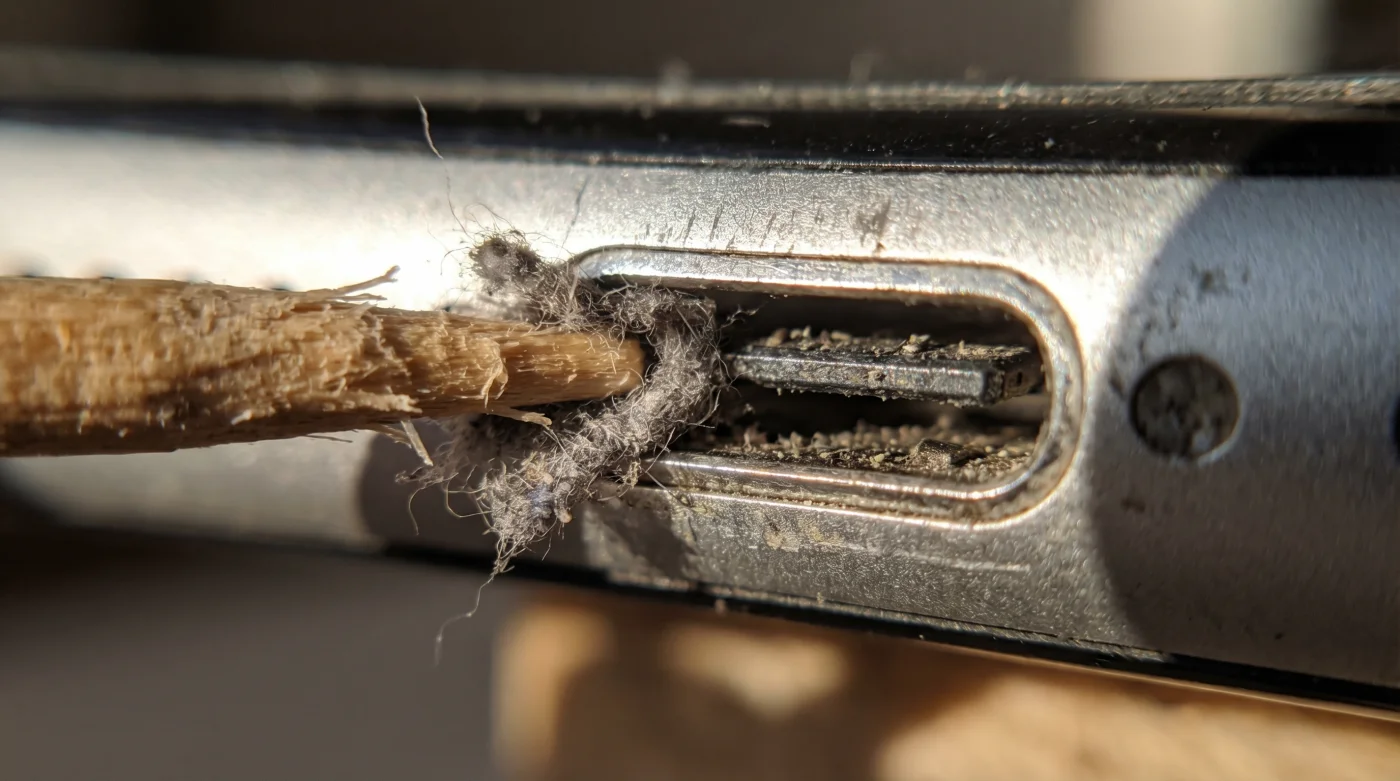 Debes usar la punta para aflojar el polvo terroso primero, trabajando en un espacio bien iluminado y tranquilo, sin presionar jamás hacia el fondo. Deja que la gravedad haga el resto del trabajo antes de intentar arrastrar los fragmentos pesados hacia el exterior de la ranura.
