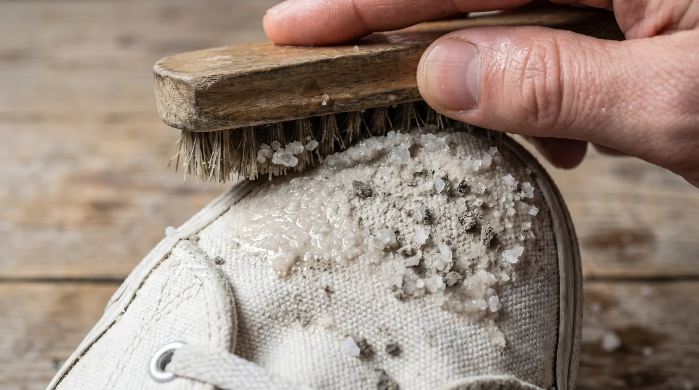 La sal gruesa de mar cambia por completo las reglas del juego. No actúa como un líquido invasivo, sino como un micro-exfoliante puramente mecánico. Sus cristales irregulares tienen la dureza exacta para meterse entre los hilos y arrancar la suciedad desde la raíz. Es como respirar a través de una almohada limpia; la tela de tus zapatos vuelve a sentir el aire circulando entre sus poros.