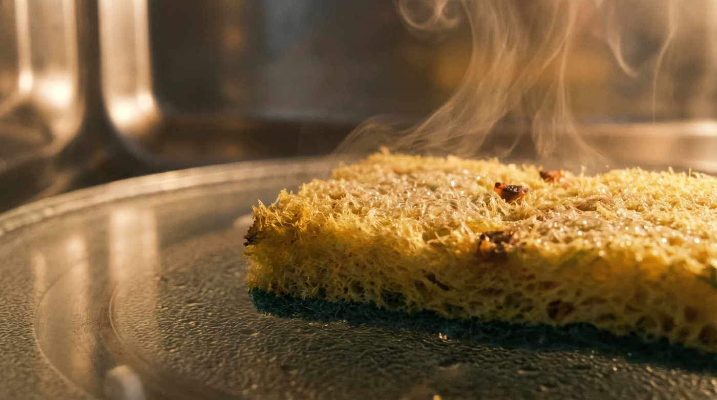 El agua pasa de estado líquido a gaseoso directamente en el núcleo de la esponja. Ese vapor ardiente empuja hacia afuera con fuerza, esterilizando cada milímetro de material a su paso. Las bacterias responsables de esa fragancia a trapo viejo no soportan este choque térmico repentino y masivo; su estructura colapsa y dejan de existir. Lo que parecía un problema crónico de higiene del hogar se resuelve magistralmente con pura termodinámica aplicada al fregadero.